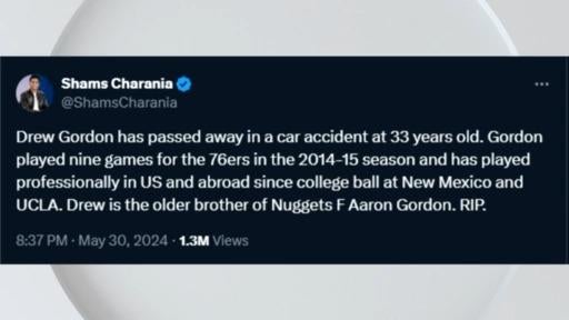Drew Gordon, the older brother of Denver Nuggets forward Aaron Gordon, died following a car crash in Clackamas County, Oregon. He was 33 years old, NBA Insider Shams Charania reported on Thursday evening.
