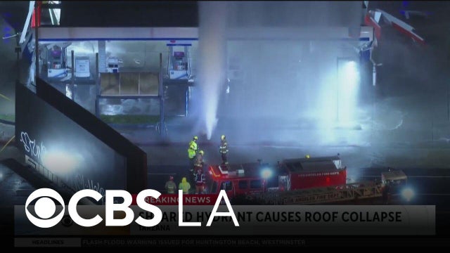 The roof of a gas station is destroyed as a sheared hydrant produces a powerful geyser.