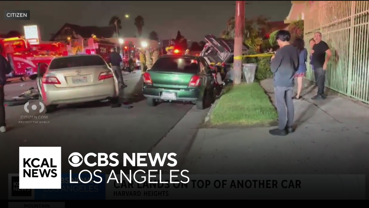 The crash caused the suspect's vehicle to land on top of one of the cars they hit in Harvard Heights early Saturday morning.