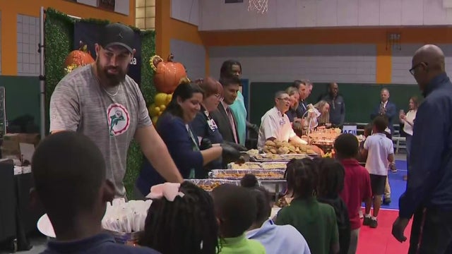 Over 150 children were fed and given Miami Dolphins memorabilia ahead of the Thanksgiving holiday.