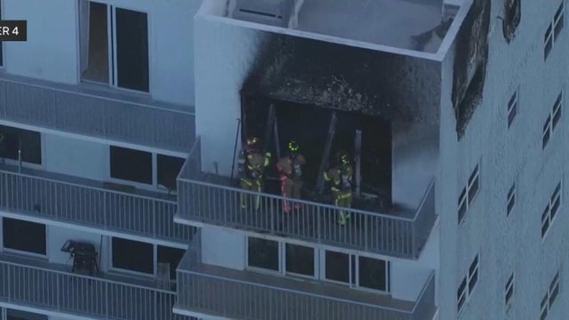 Images from Chopper 4 showed large flames and thick black smoke rising from one of the building's top floors.