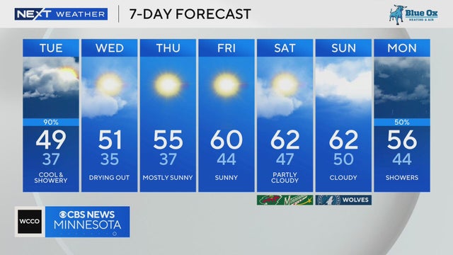 Tuesday will see rain wrapping up about 6 p.m. along with windy conditions and highs stalling out in the mid-40s, WCCO meteorologist Katie Steiner reports.