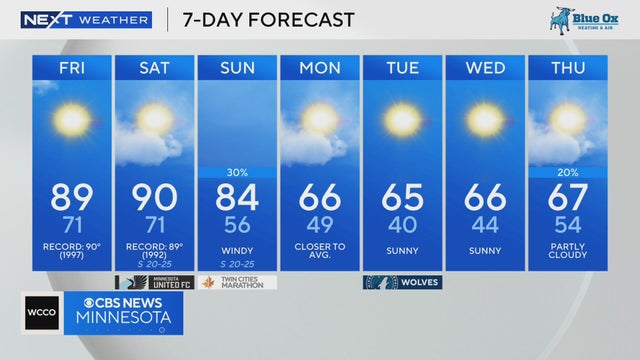 Highs will get near 90 degrees on Friday in the Twin Cities, with warm overnight lows near 70.