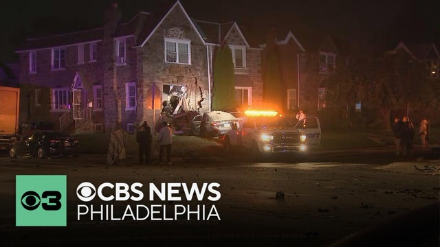 A car left a hole in the side of a Philadelphia home at Oxford Avenue and Horrocks Street.