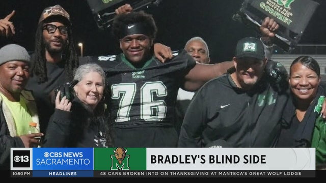This Thanksgiving, Manteca High School football star Kevin Bradley has a ton to be thankful for. The self-proclaimed "gentle giant" has helped the Buffaloes dance their way into the section playoffs. But Bradley almost wasn't a part of the herd. Jake Gadon has the story.